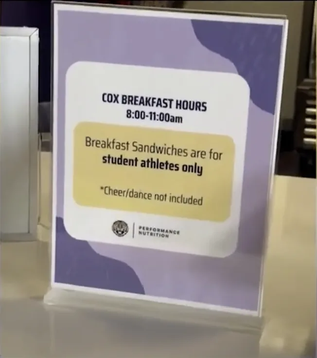 A sign at LSU’s athletic dining facility has sparked outrage across the cheer and dance community. The sign states that breakfast sandwiches are available only for student-athletes, explicitly noting that “cheer/dance not included.” The blatant exclusion has fueled frustration among LSU Spirit Squad members and their supporters, calling attention to a longstanding debate about the recognition of cheer and dance as true collegiate athletics.