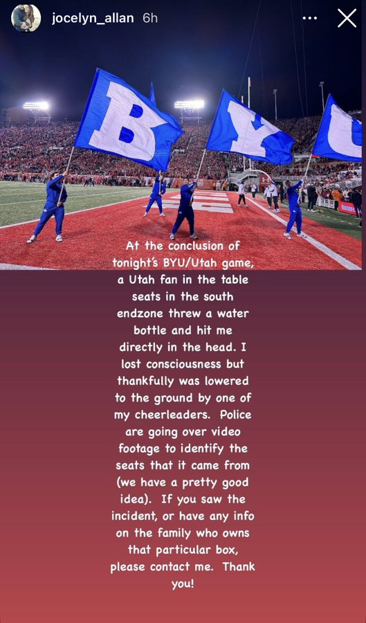 Police are investigating an incident involving BYU cheerleading coach Jocelyn Allan, who reported being struck by a water bottle thrown from the crowd following BYU’s recent game against Utah. Allan stated that the object hit her in the head, causing her to lose consciousness before being lowered to the ground by a cheerleader.
