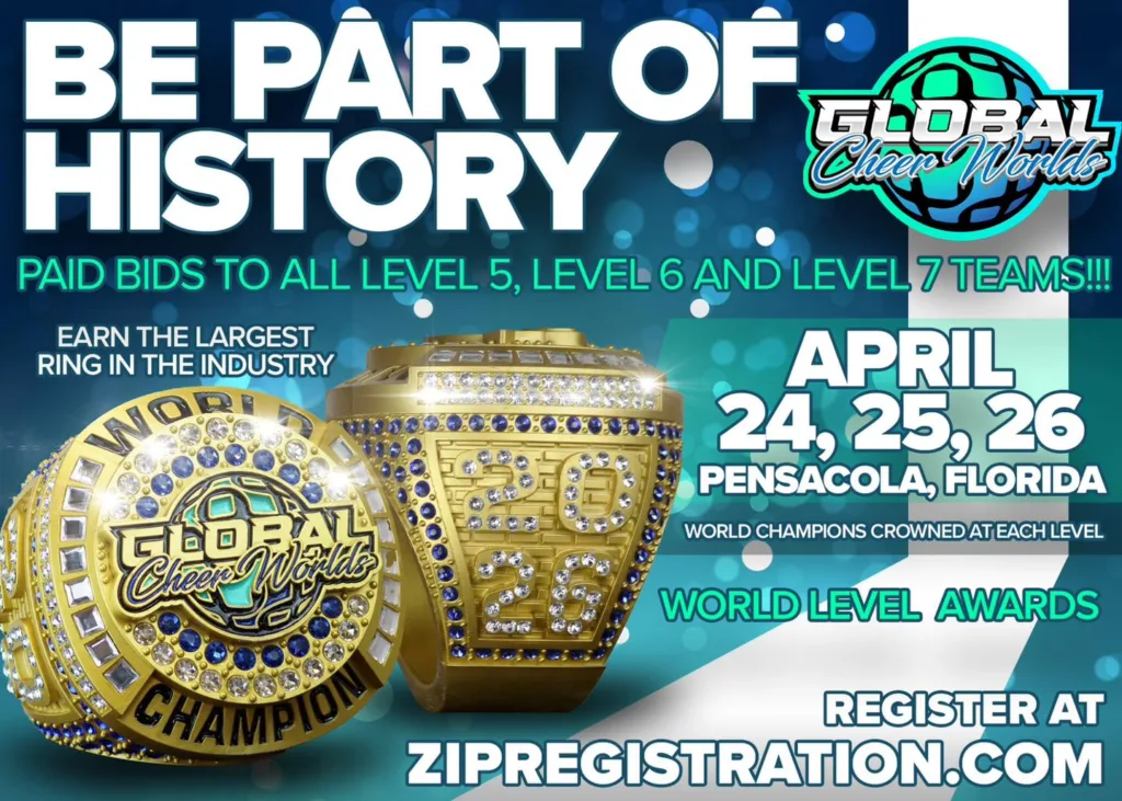 Global Cheer & Dance has announced that Paid Bids will be awarded to all Level 5, 6, and 7 teams interested in attending the 2026 Global Cheer Worlds. The championship event will take place April 24–25, 2026, at Blue Wahoos Stadium in Pensacola, Fla.