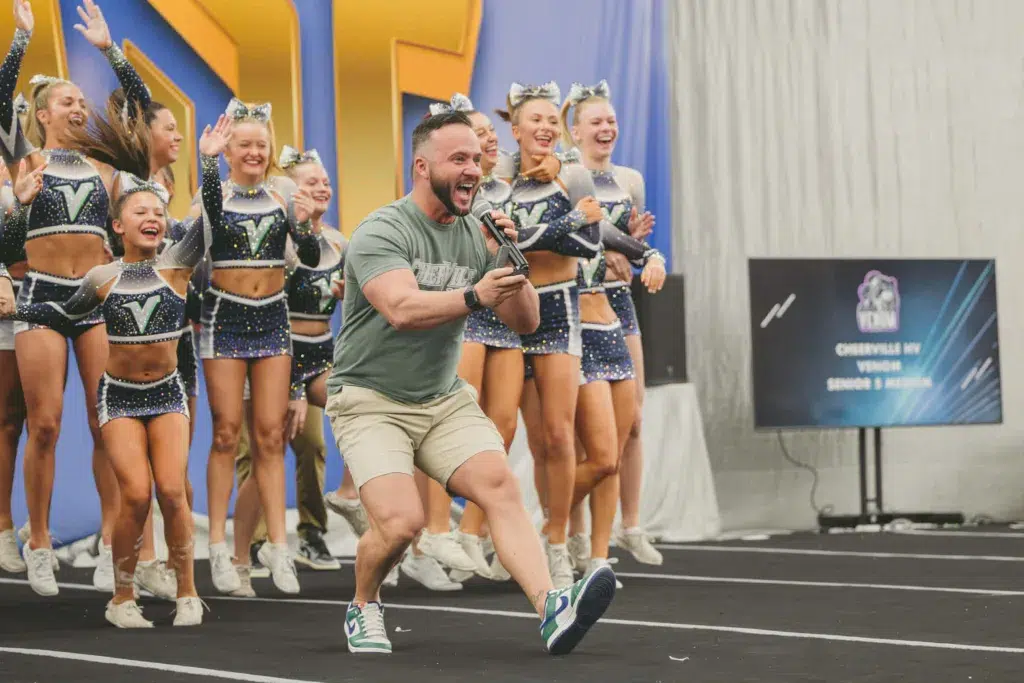 At Cheerville’s showcase last weekend, the athletes weren’t the only ones preparing for a big moment. Coaches Alexa and Michael—two powerhouse leaders whose relationship has grown through six seasons, two states, and countless competitive highs, were about to experience a memory that would become part of gym history.